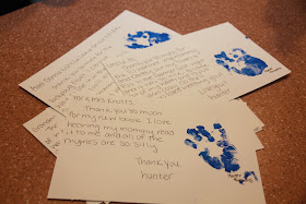 I should come as no surprise that our little man cannot write! However, I felt that it was important to have him take part in the thank you notes. So this brave mommy pulled out the paint and with help from daddy we had Hunter "sign" each note with a hand print! A majority were super messy but worked... it is difficult to get a 4 month old to lay his hand flat!